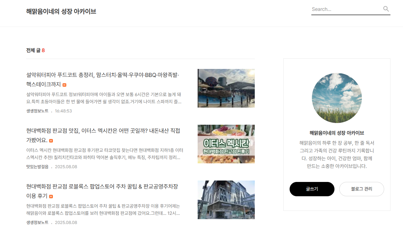 2025년 7월부터 해맑음이의 초등매일루틴 네이버 블로그를, 8월부터 해맑음이맘의 성장 아카이브 티스토리를 정식으로 시작했어요.