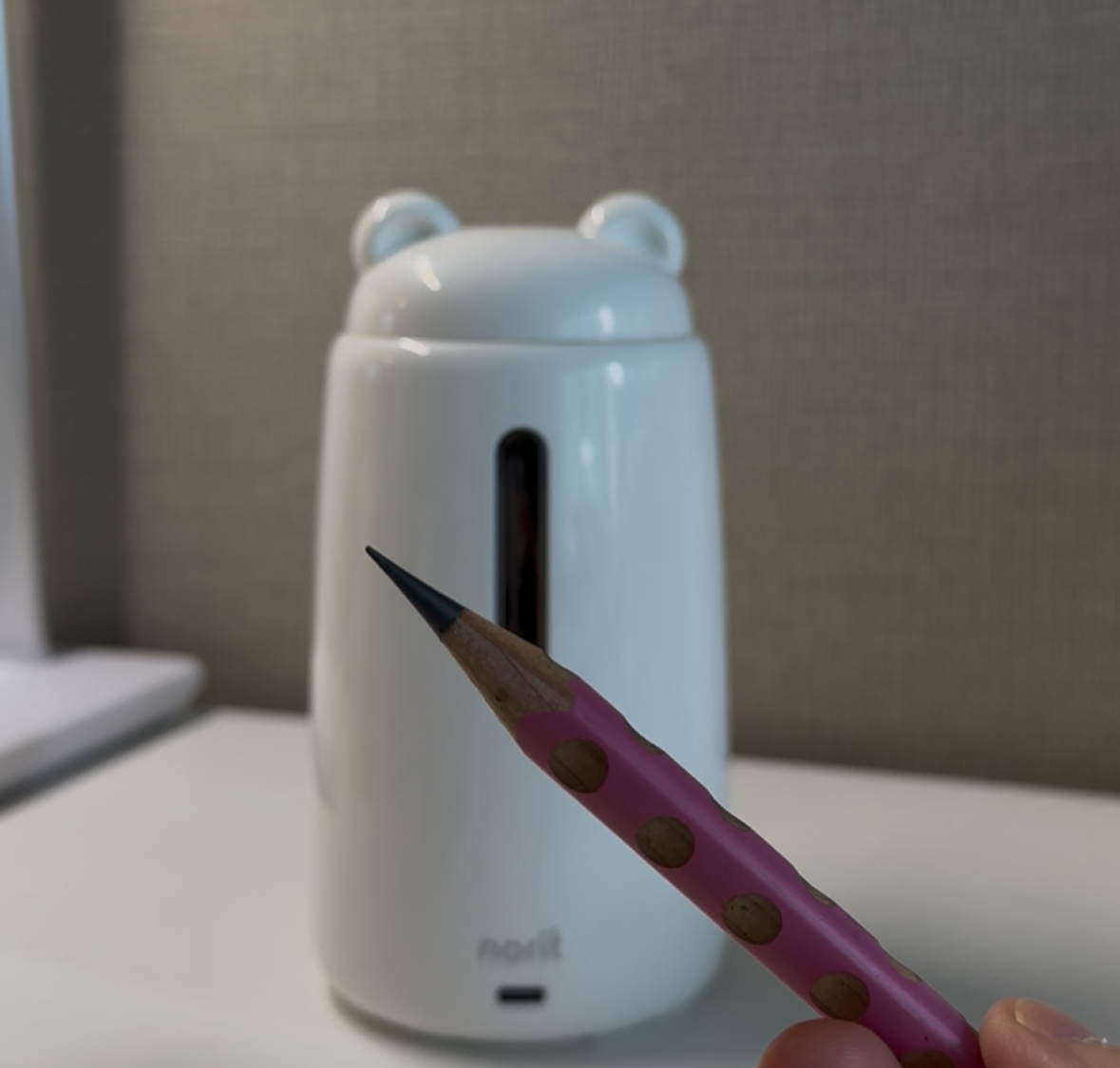 노르잇 자동연필깎이는 점보연필까지 호환되고, 부러진 연필심 자동배출과 3단계 두께 조절이 가능한 충전식 전동연필깎이에요.
