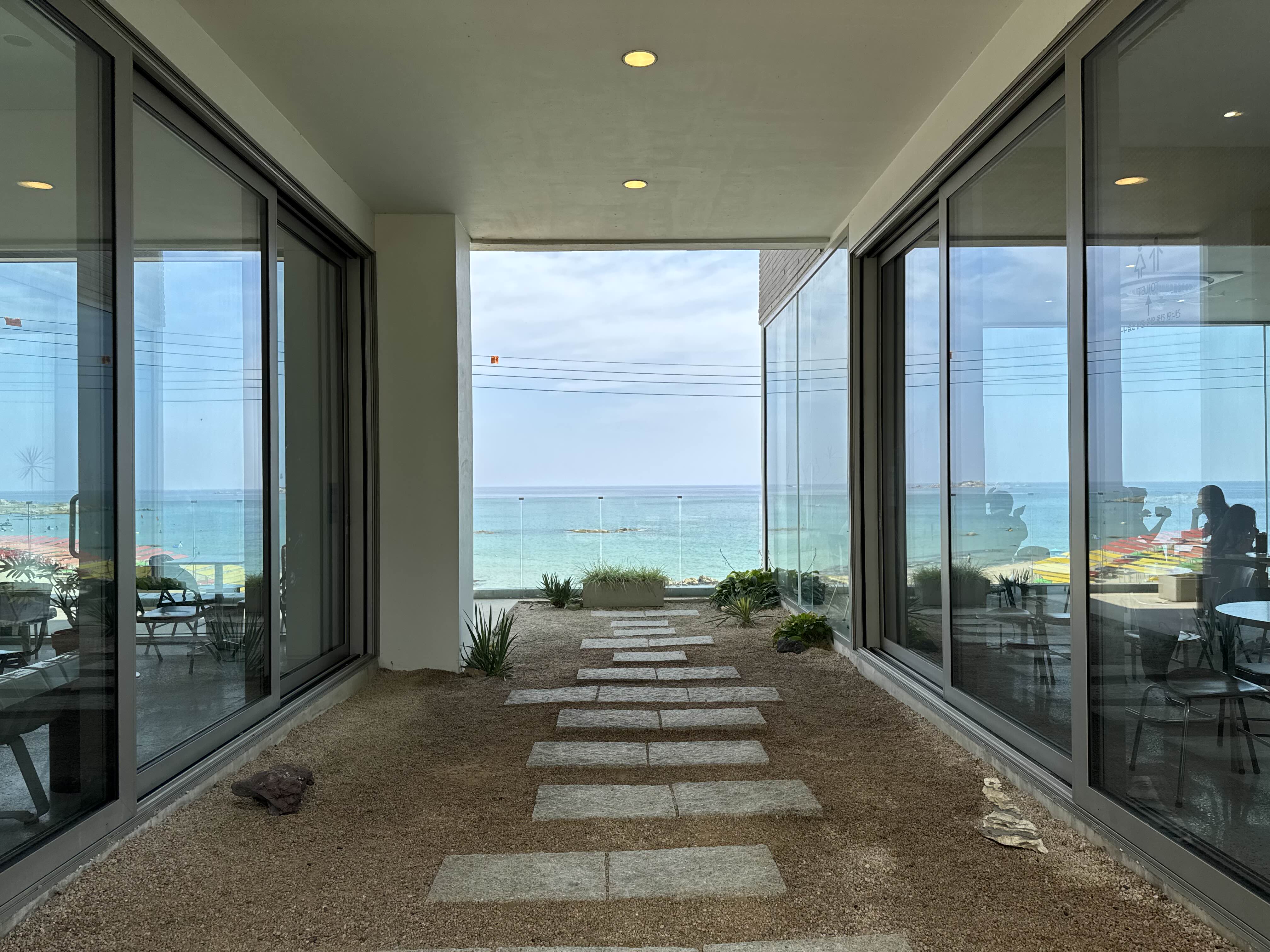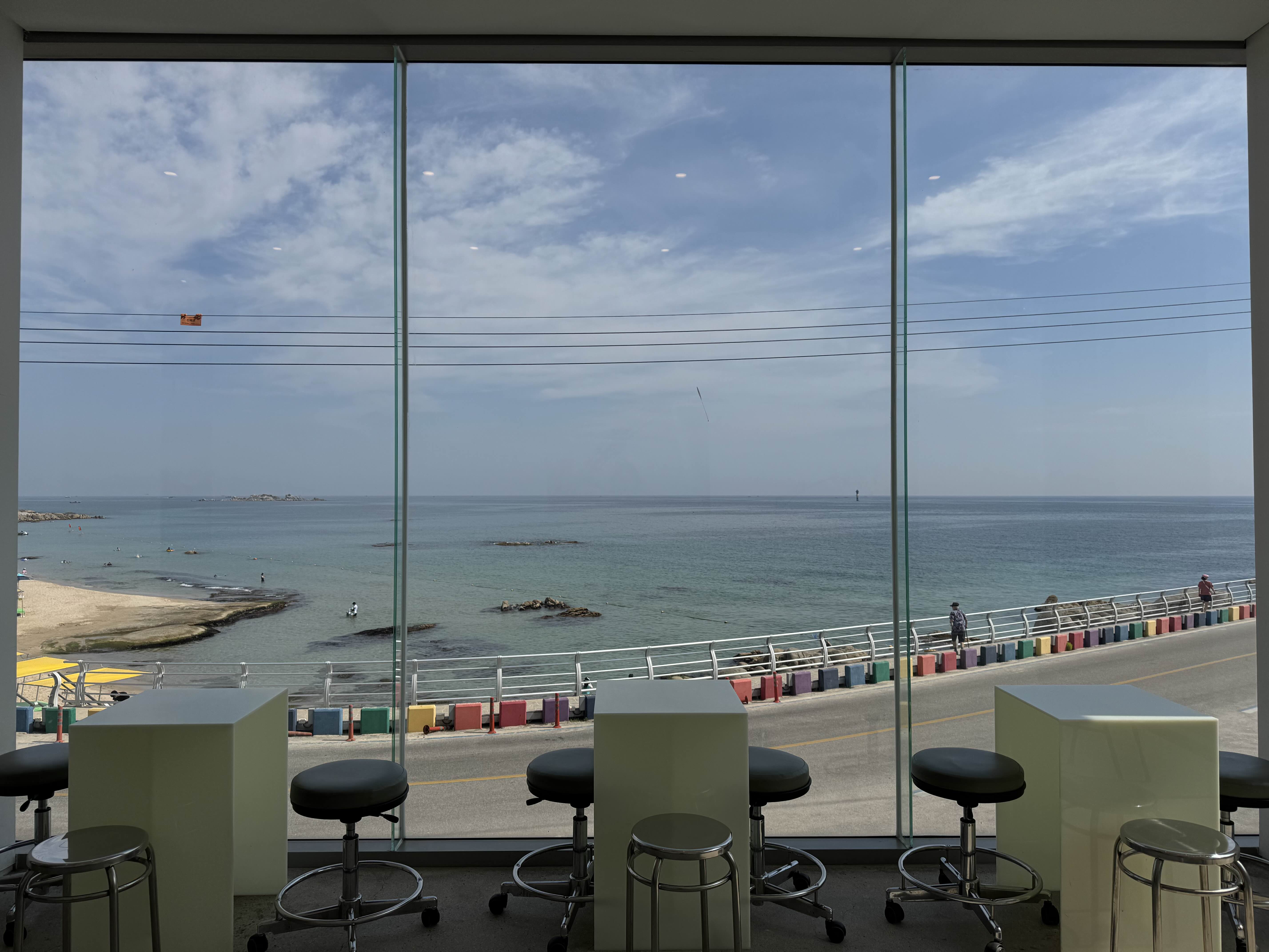 카페에 들어서자마자 보이는 통유리 창 너머의 바다는 그야말로 그림 같은 풍경이에요.