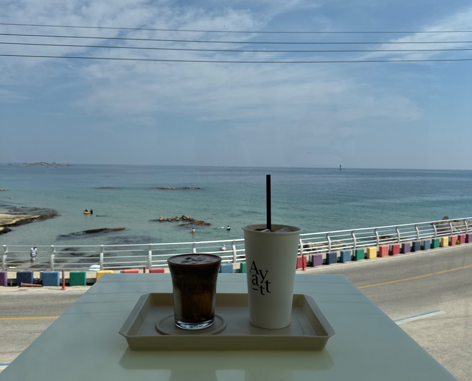 바로 앞에 위치한 바다뷰카페 아야트커피에서는 시그니처 흑임자라떼와 바닐라라떼를 즐길 수 있어