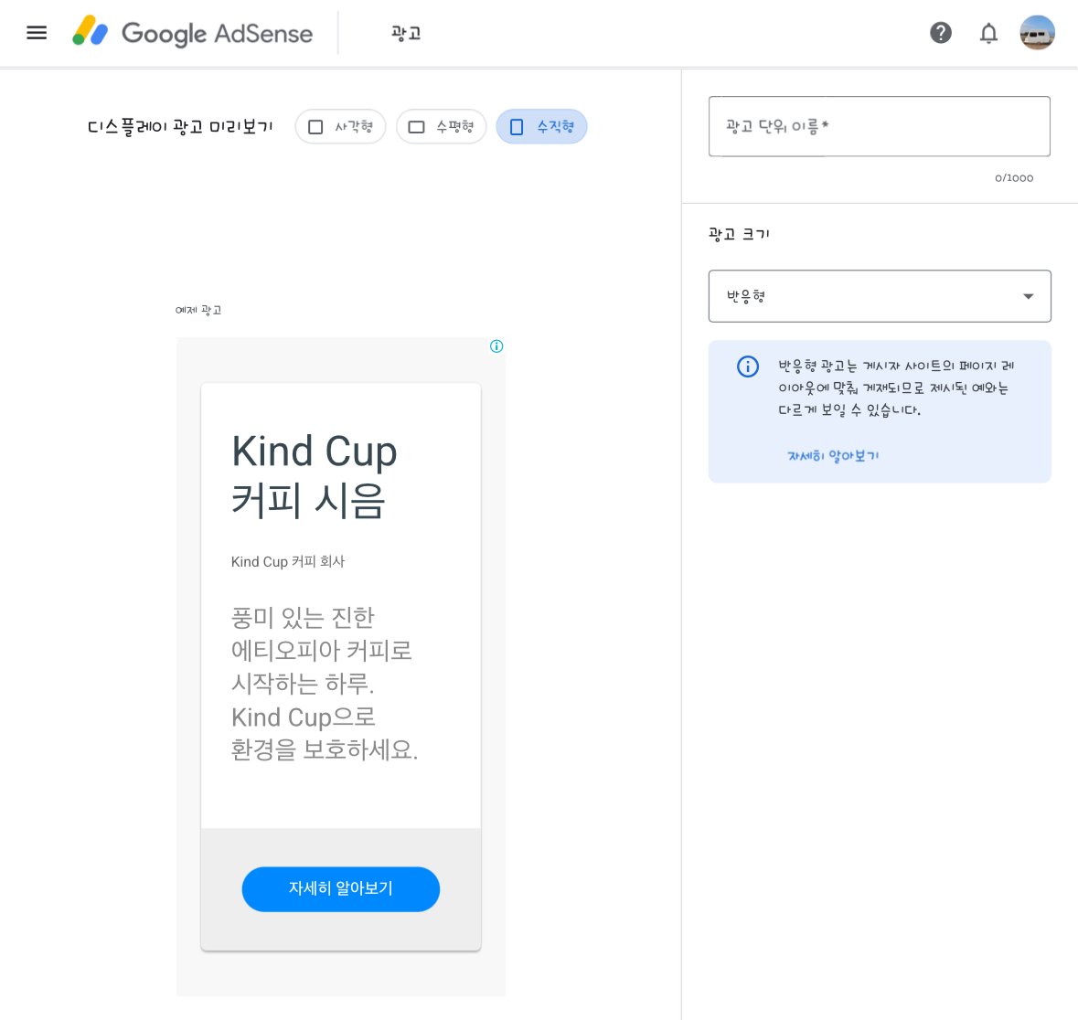 - 미리 광고 설정 : 디스플레이 사각형 반응형 광고 등 다양하게 크기별로 광고를 미리 만들어요.