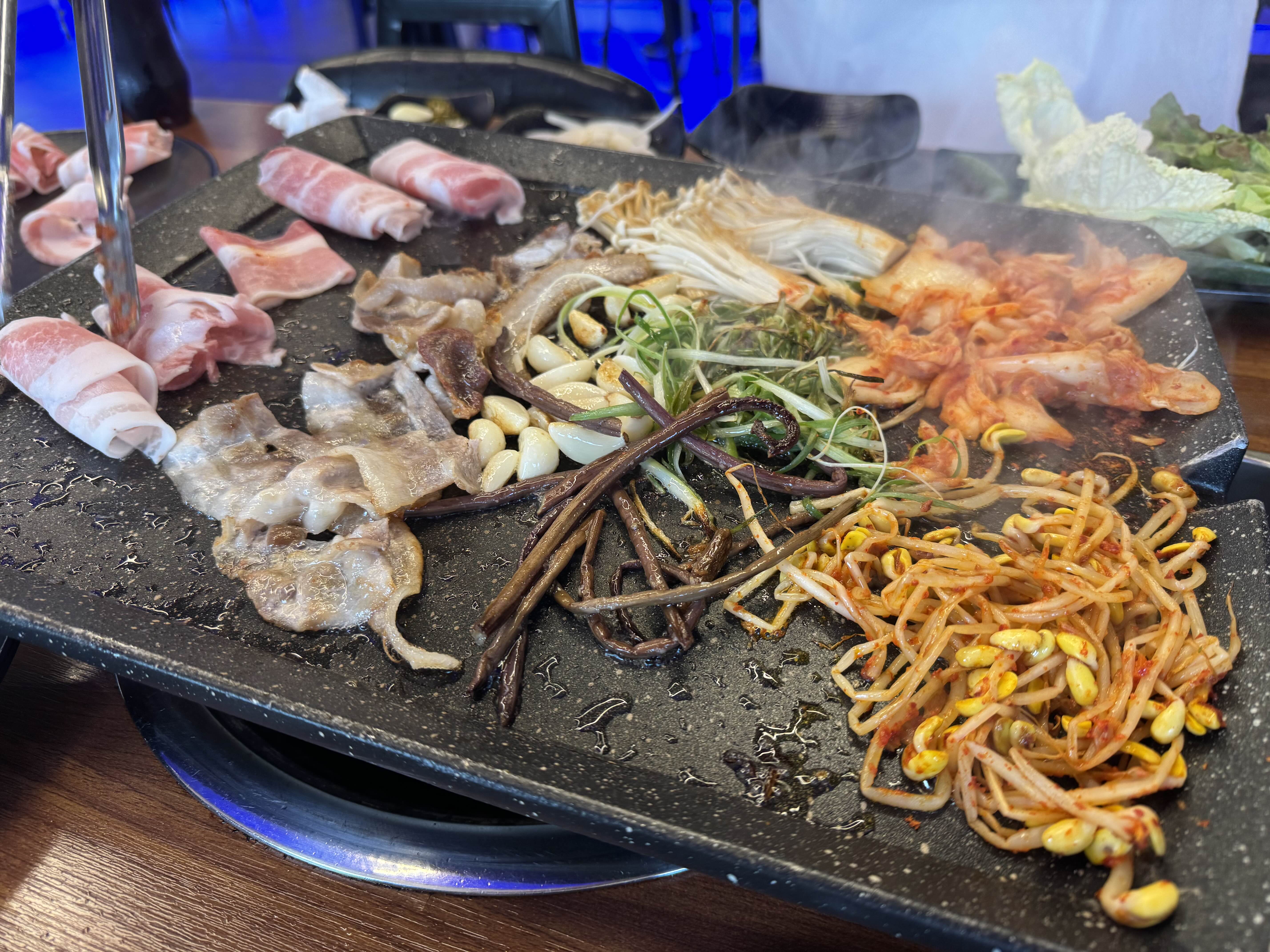 김치, 콩나물, 고사리 등등 불판 위에 올려 구워 먹는 조합이 최고!